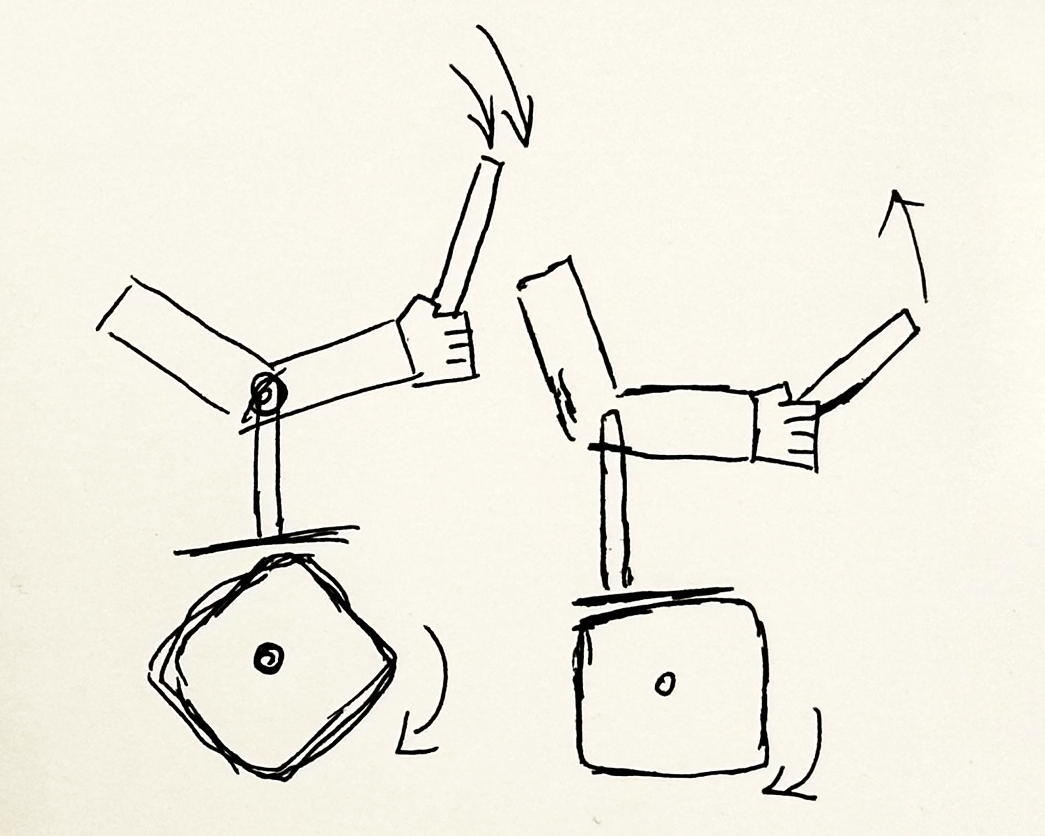 Before replicating the design for a wooden automaton, I watched additional videos of Yaogu performances. I noticed that the drummers lift their arms very high, in contrast to the limited movement my cardboard prototype produced. I wanted to create a more accurate depiction of the drumming, so I began considering other mechanisms.