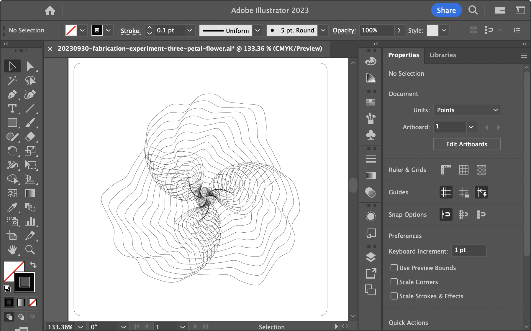 This week, I have been experimenting with laser engraving. I wanted to continue incorporating computational thinking into my process, so the first thing I thought of was to create a p5.js sketch for the laser engraver. Although raster files can be used for etching, I think it would be more interesting to generate a vector path for the laser engraver.
