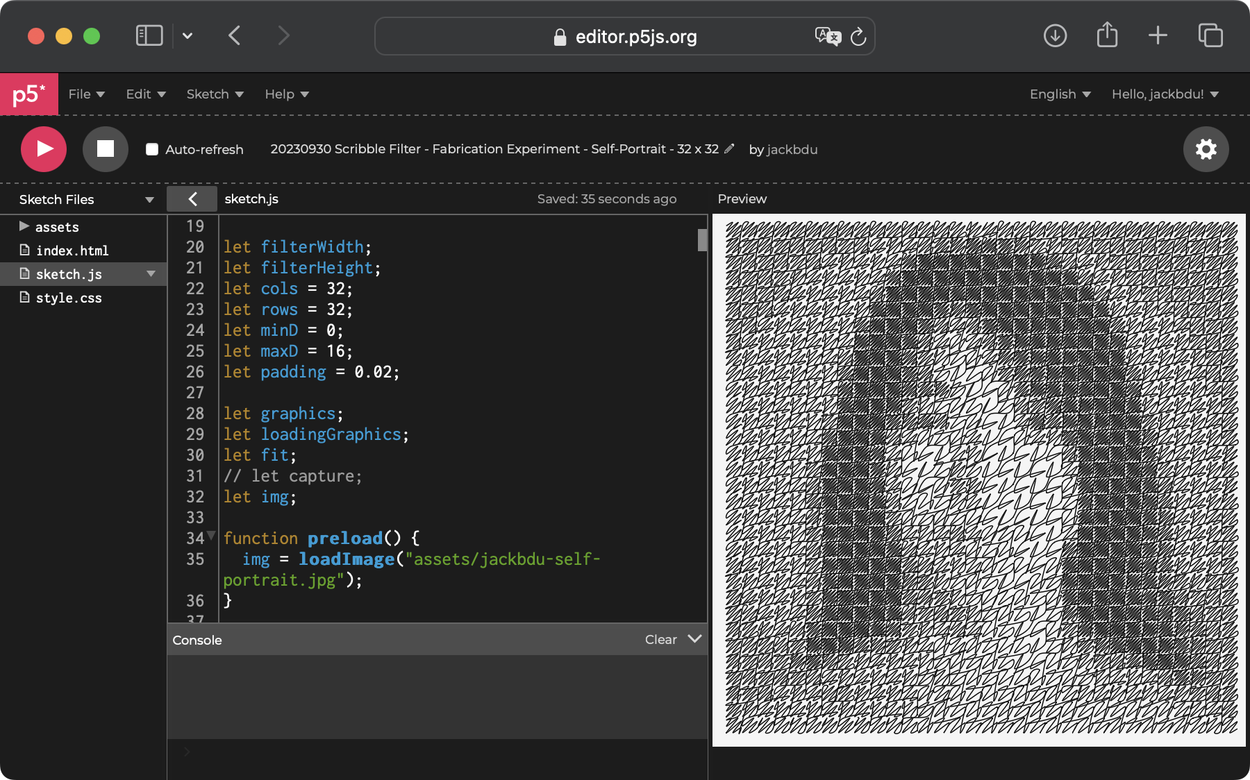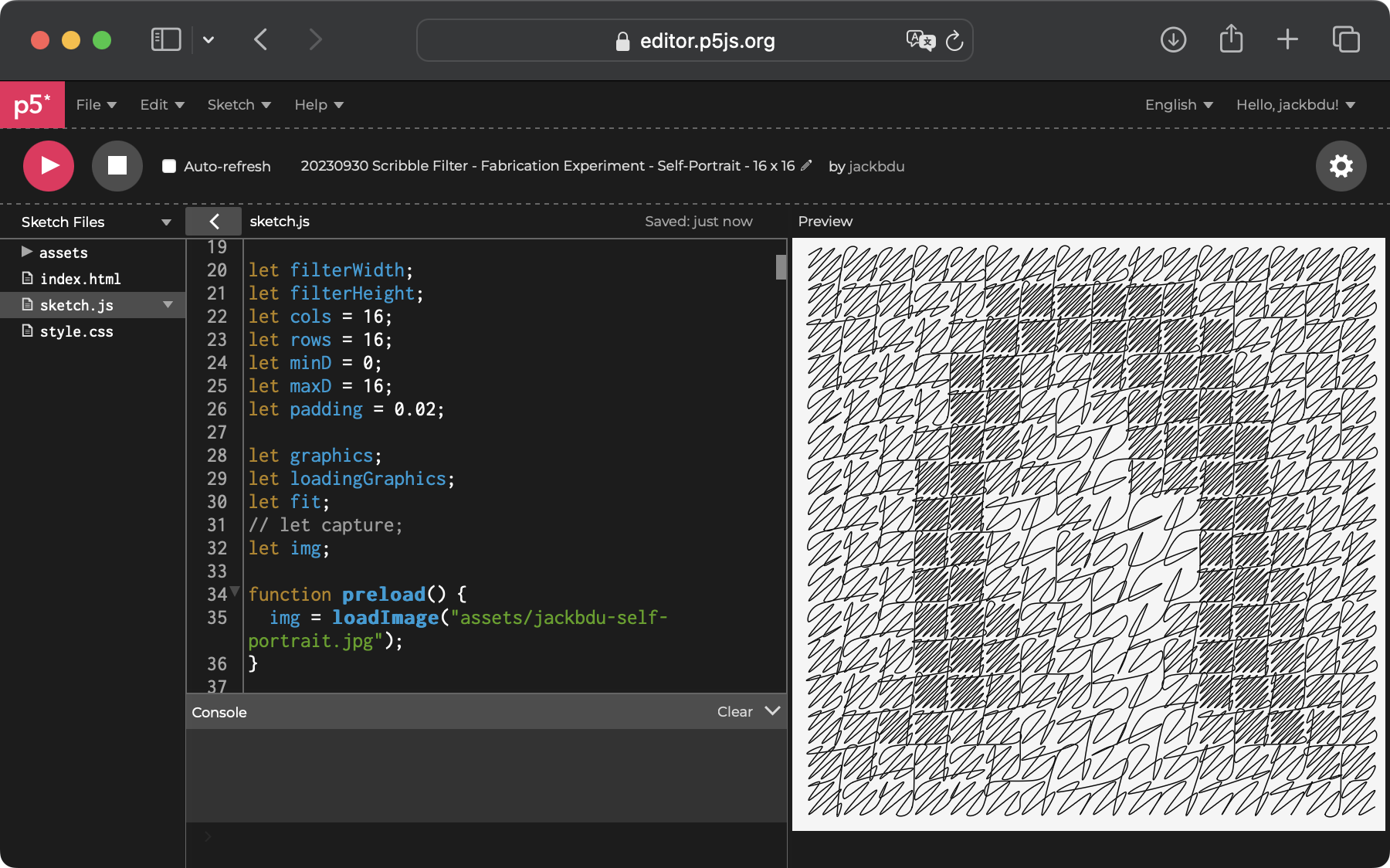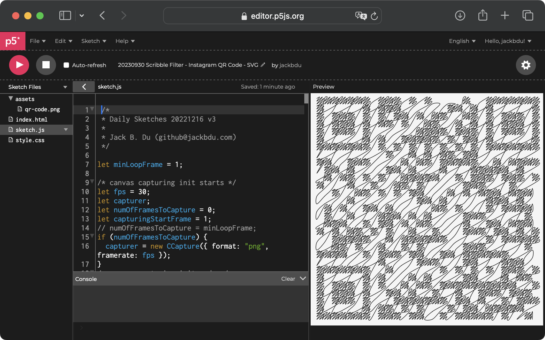 After some initial experiments with the SVG runtime, I decided to test it out with one of my old sketches, which could convert any reference image to a drawing formed by scribbles (in the sketch below, the reference image is a QR code). To my surprise, it worked right away after doing the steps above.