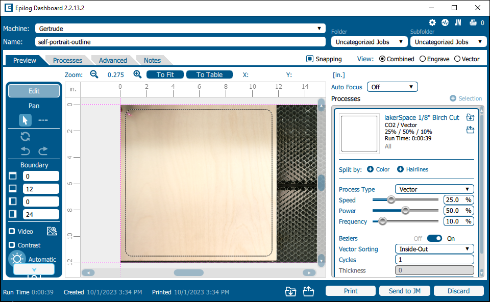 I sent engraving and cutting as two separate jobs to the Epilog Laser Engraver.