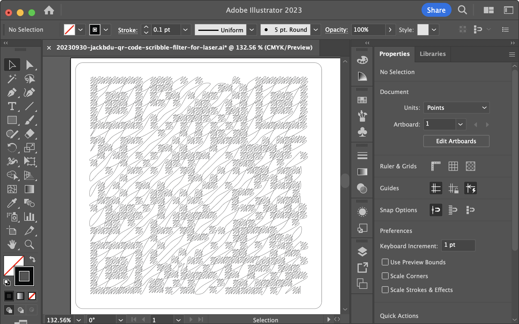 In Adobe Illustrator, I resized the scribble (yes, singular, because it was a single continous scribble) and fitted it onto a 2.125 x 2.125 inch square with rounded corners, which was the short side of a credit card.