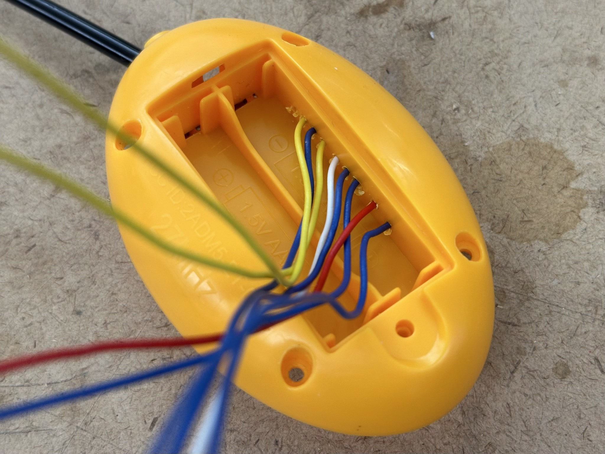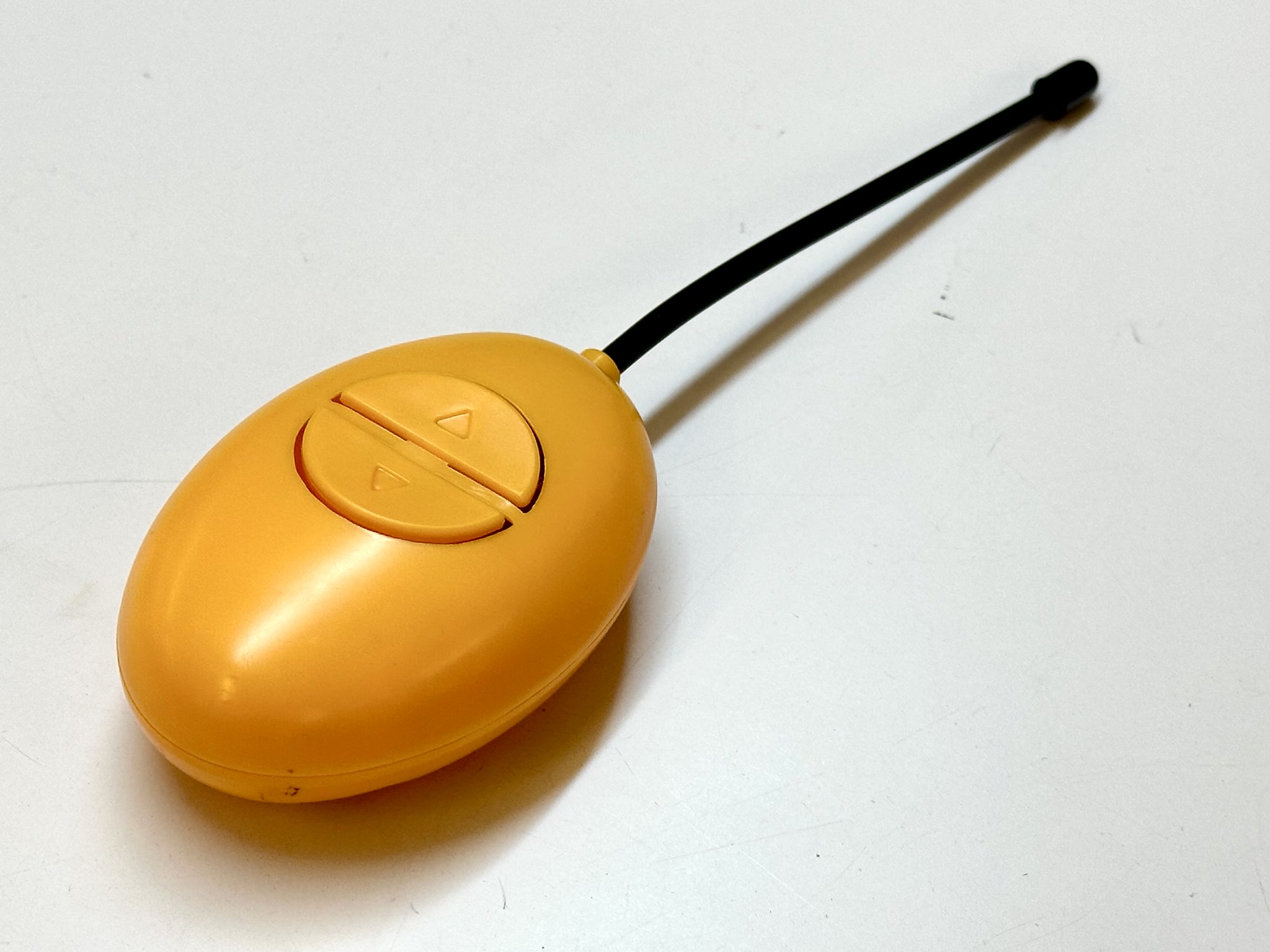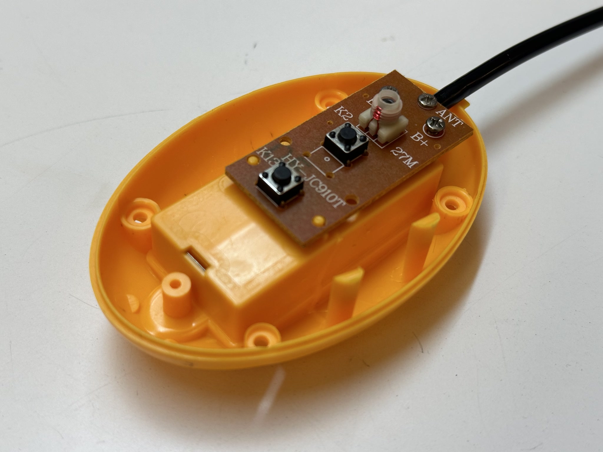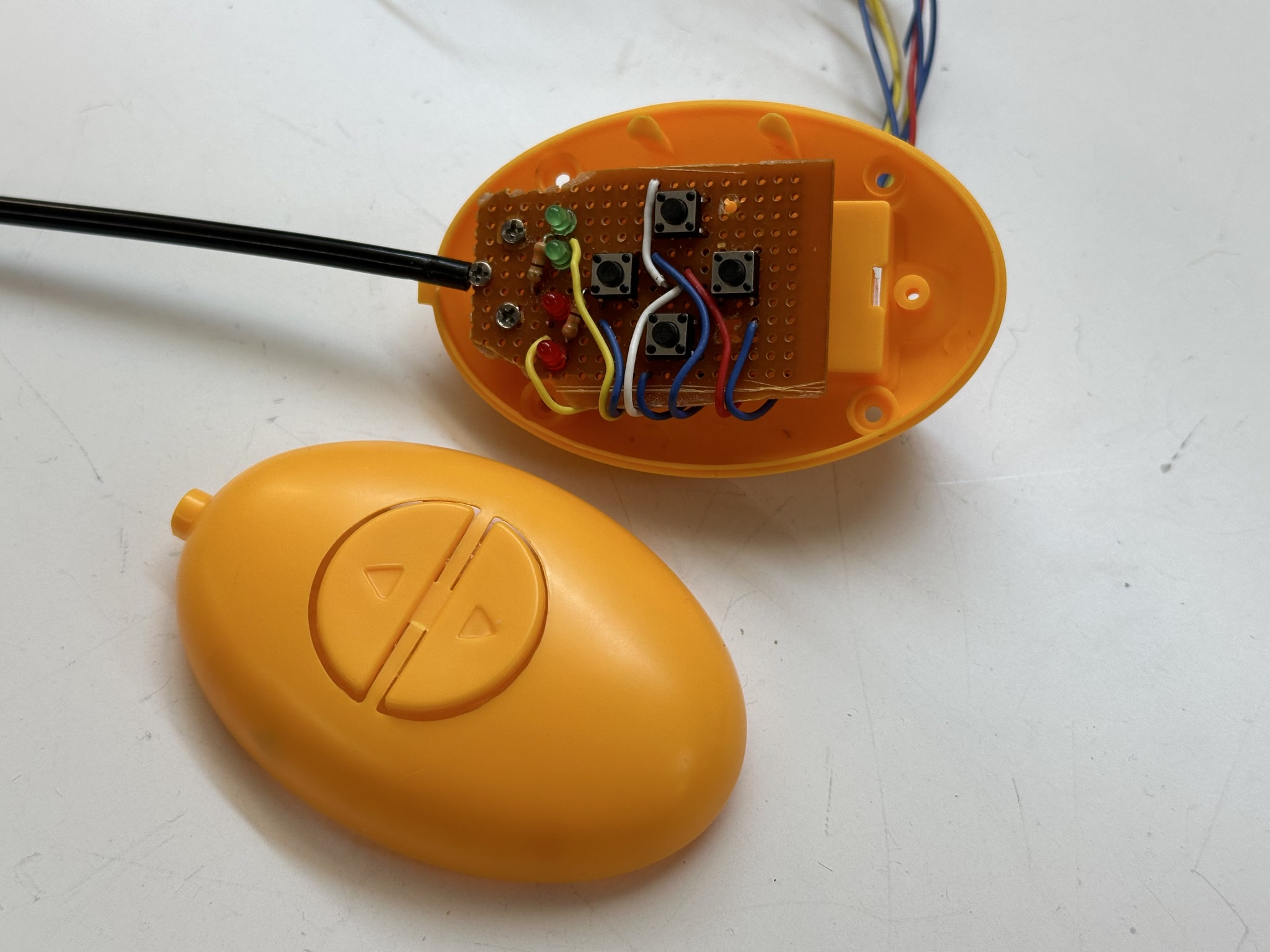I considered designing and 3D printing a custom case, but I found something even better! On the ITP/IMA junk shelf, I found a cute egg-shaped controller. I had no idea what the controller was originally for, but it had quite an ergonomic grip and it even came with a long antenna. One of the biggest issues, however, was that the controller only came with two buttons, up and down. Upon opening the controller, I thought it would be a fun challenge to try to fit four buttons in it.