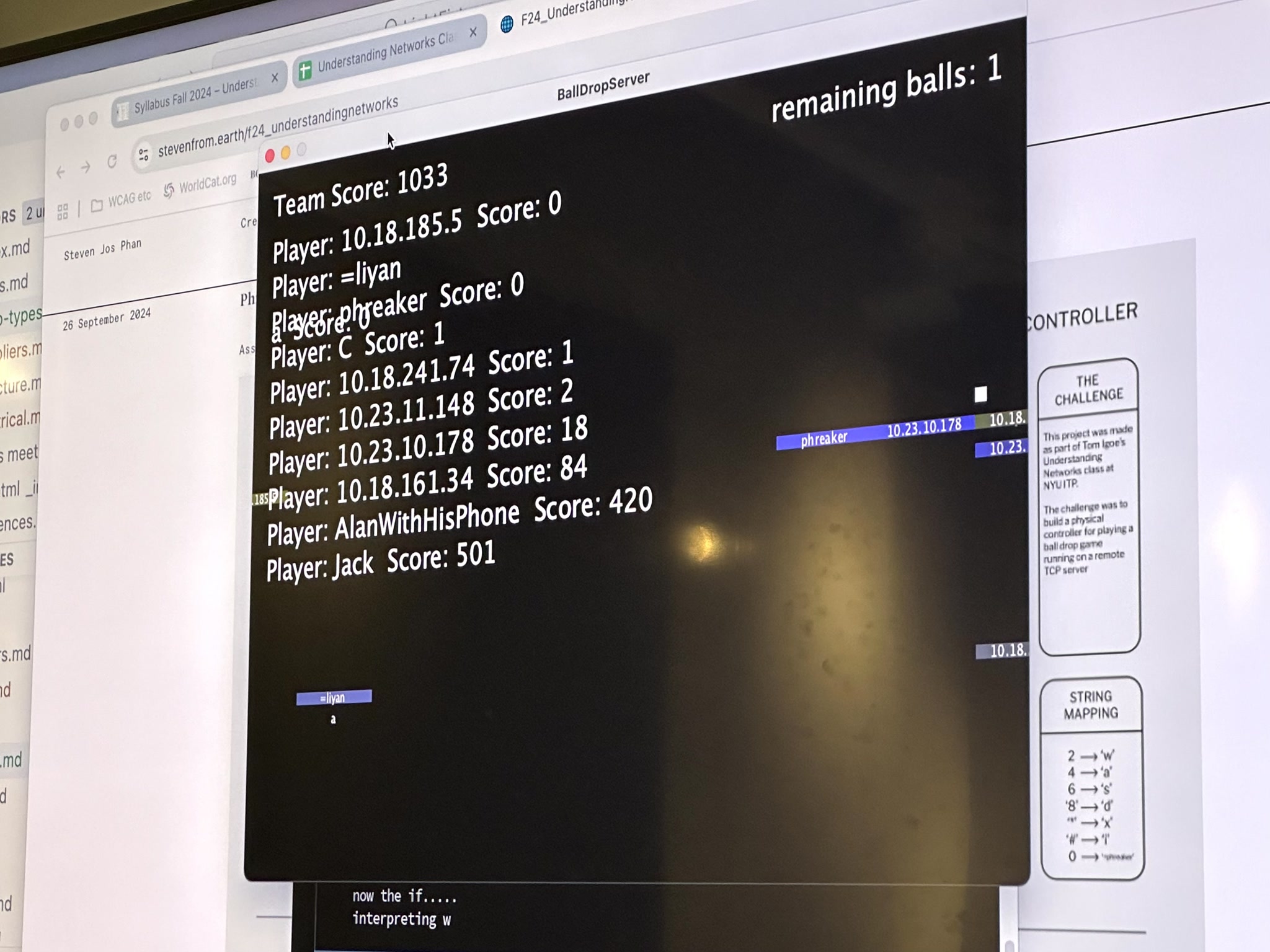 In the Understanding Networks class this week, Tom Igoe showed the class the Ball Drop Game. In Tom’s own words, the Ball Drop Game is “a multiplayer game in which players collaborate to keep a ball from hitting the ground”. To play this game, all players need to be on the same network as the game, which is a networked application written in Processing. When we played it for the first time, we all connected to the game using the netcat utility via a command line interface. The netcat utility established TCP (Transmission Control Protocol) connections from our laptops to Tom’s laptop, where the Ball Drop Game server application was running.