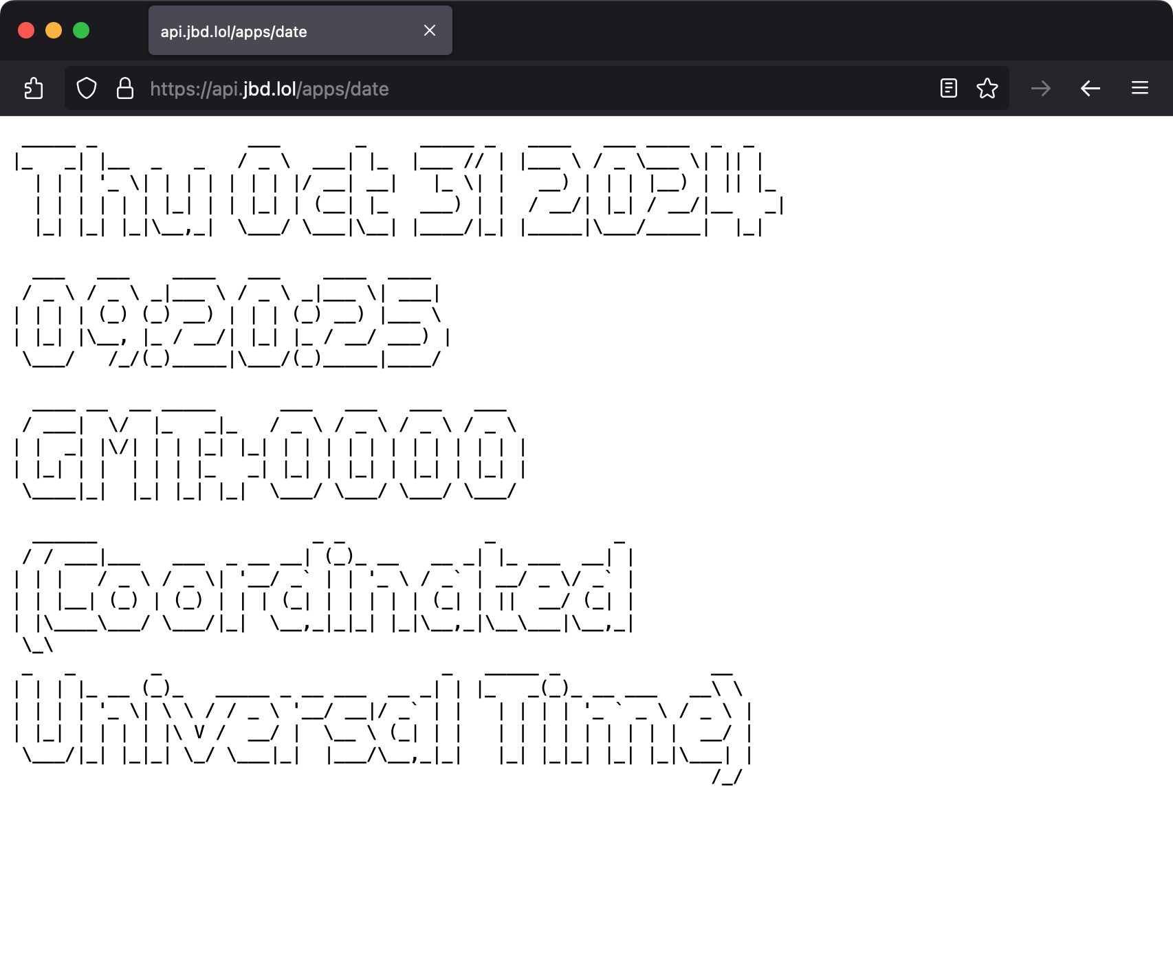 The first one is apps/date, which displays the current date on the server. I am using the figlet utility to convert the date text to ASCII art to make it a bit more fun.