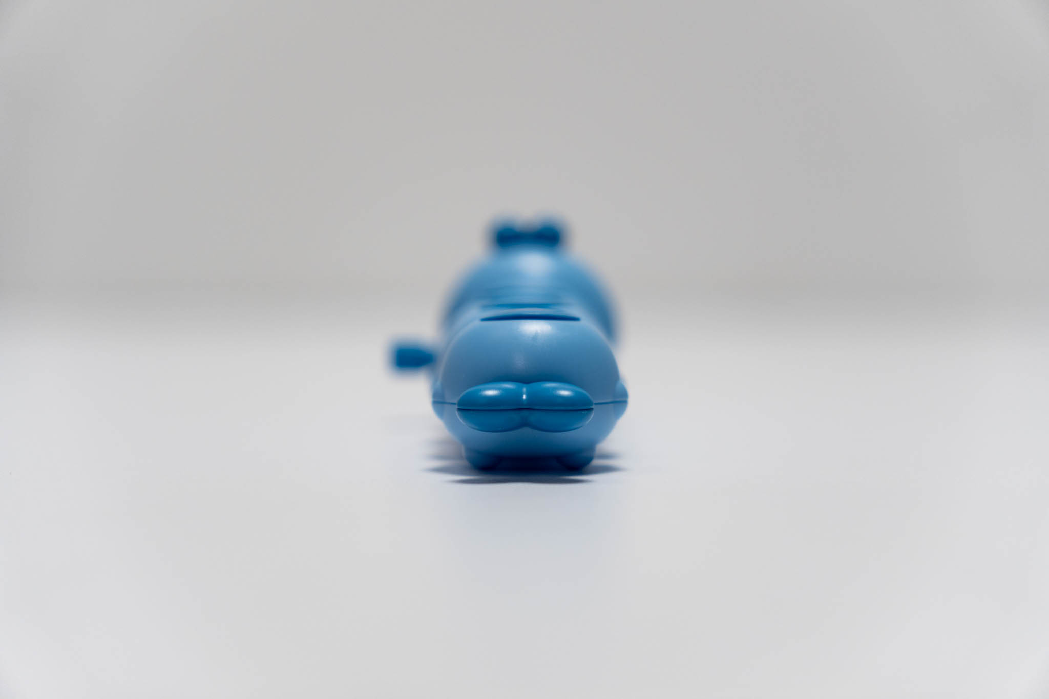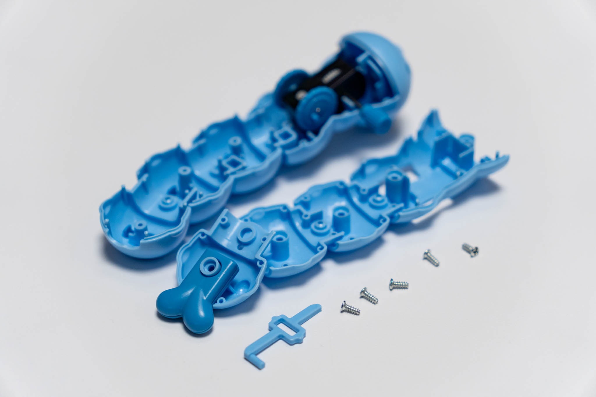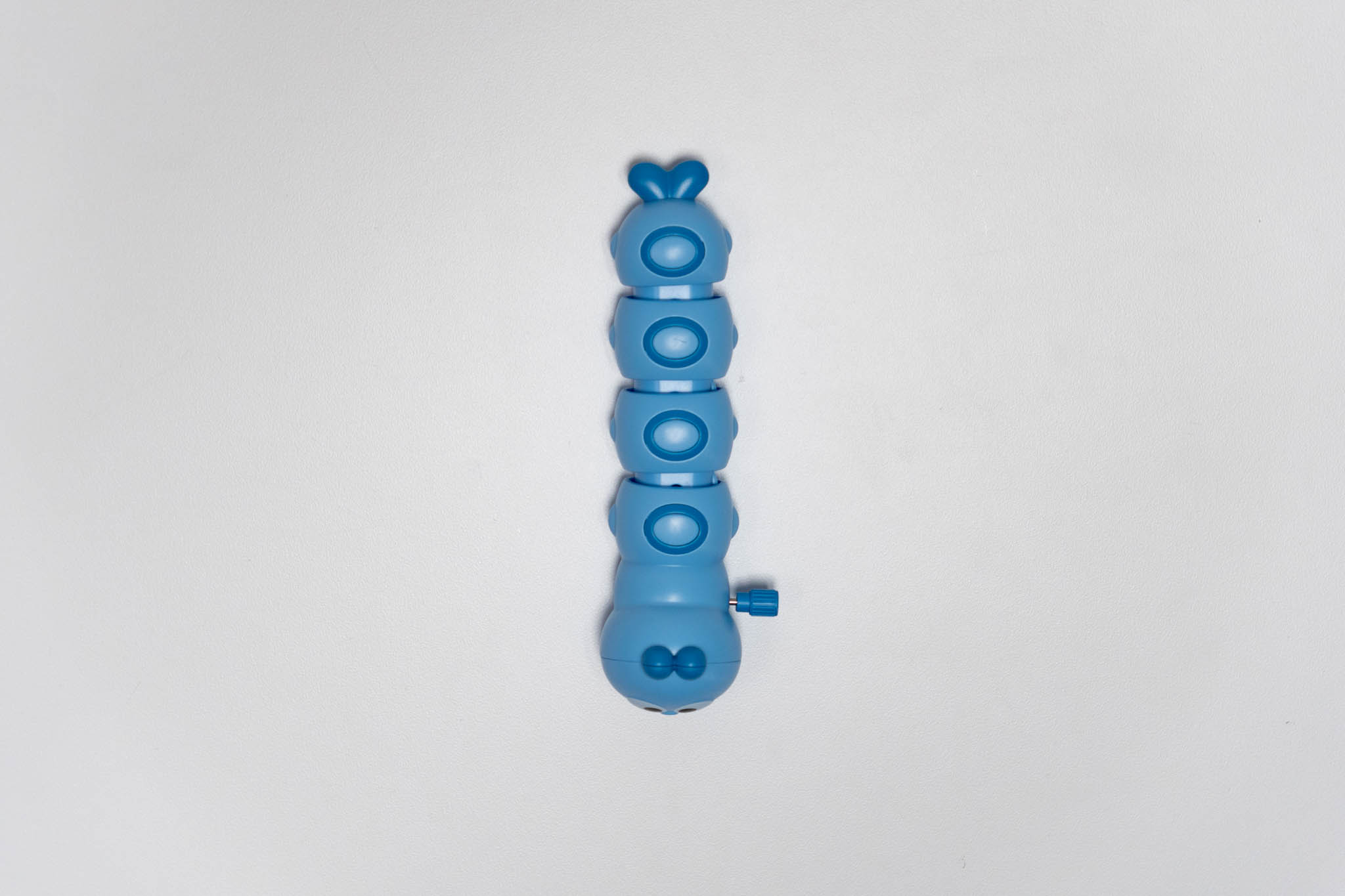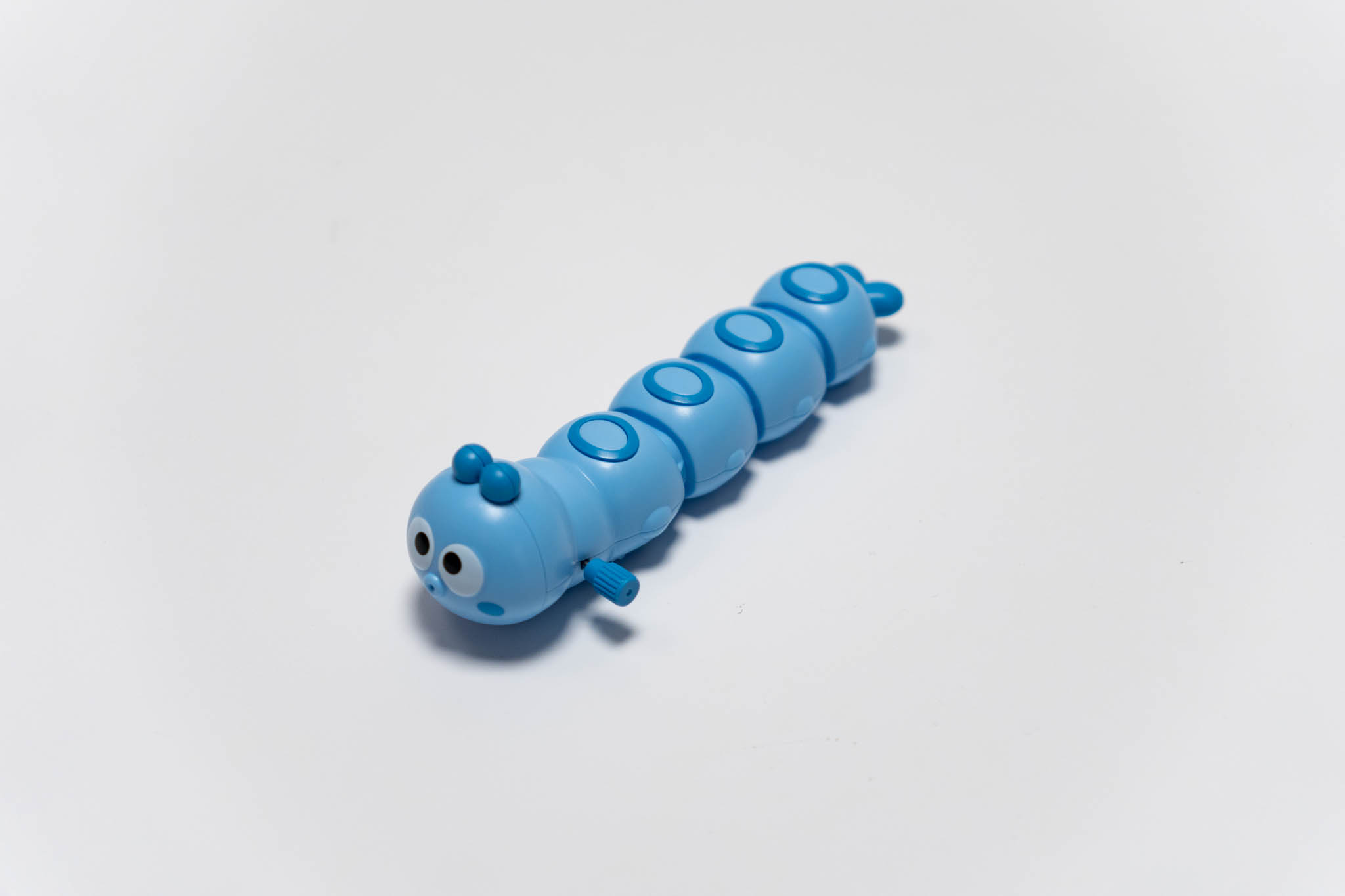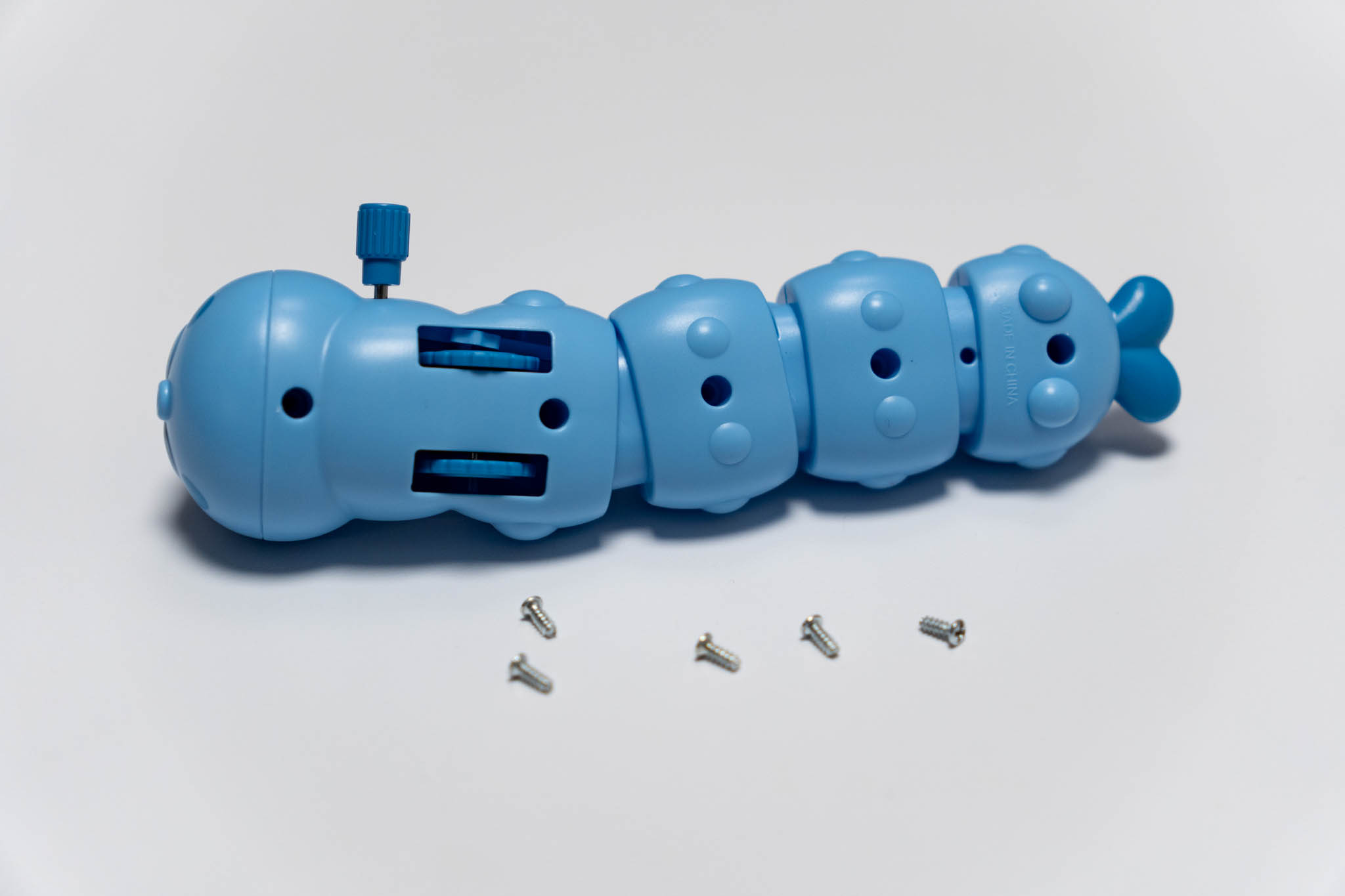 Before opening it up, I closely examined the toy. I don’t remember when it was my last time to open up a windup toy, but I imagine there is probably a spiral spring inside that is being twisted as I turn the windup knob, which stores the energy that will then be released backwards. I noticed there is a small piece of plastic stick attached to one of the wheels. For every turn the wheel rotates, the stick pushes one side of the immediately attached body segment, which makes that segment wiggle sideways. The last two segments near the rear end seem to move freely, so their movements mostly likely come from the segment before them.