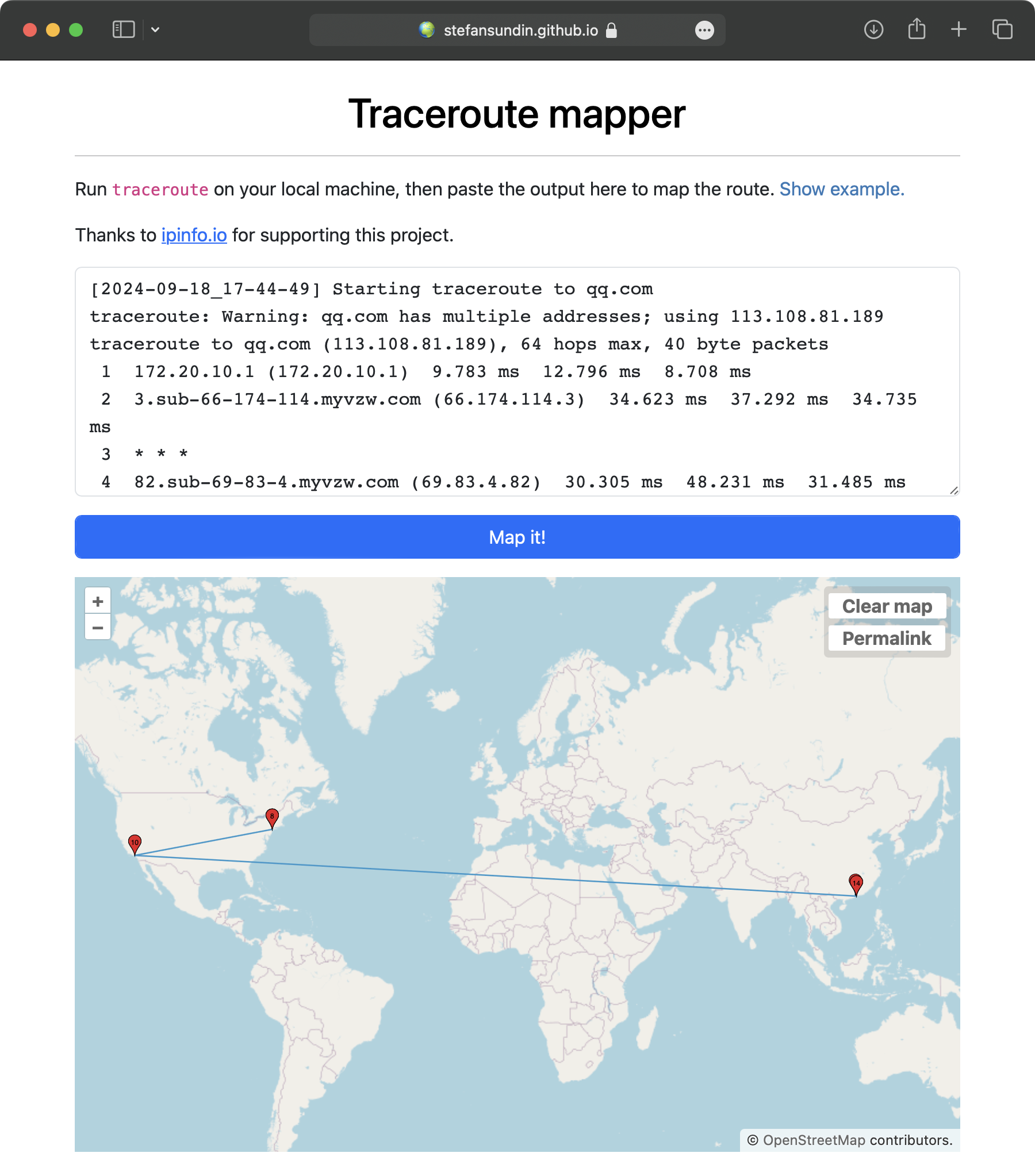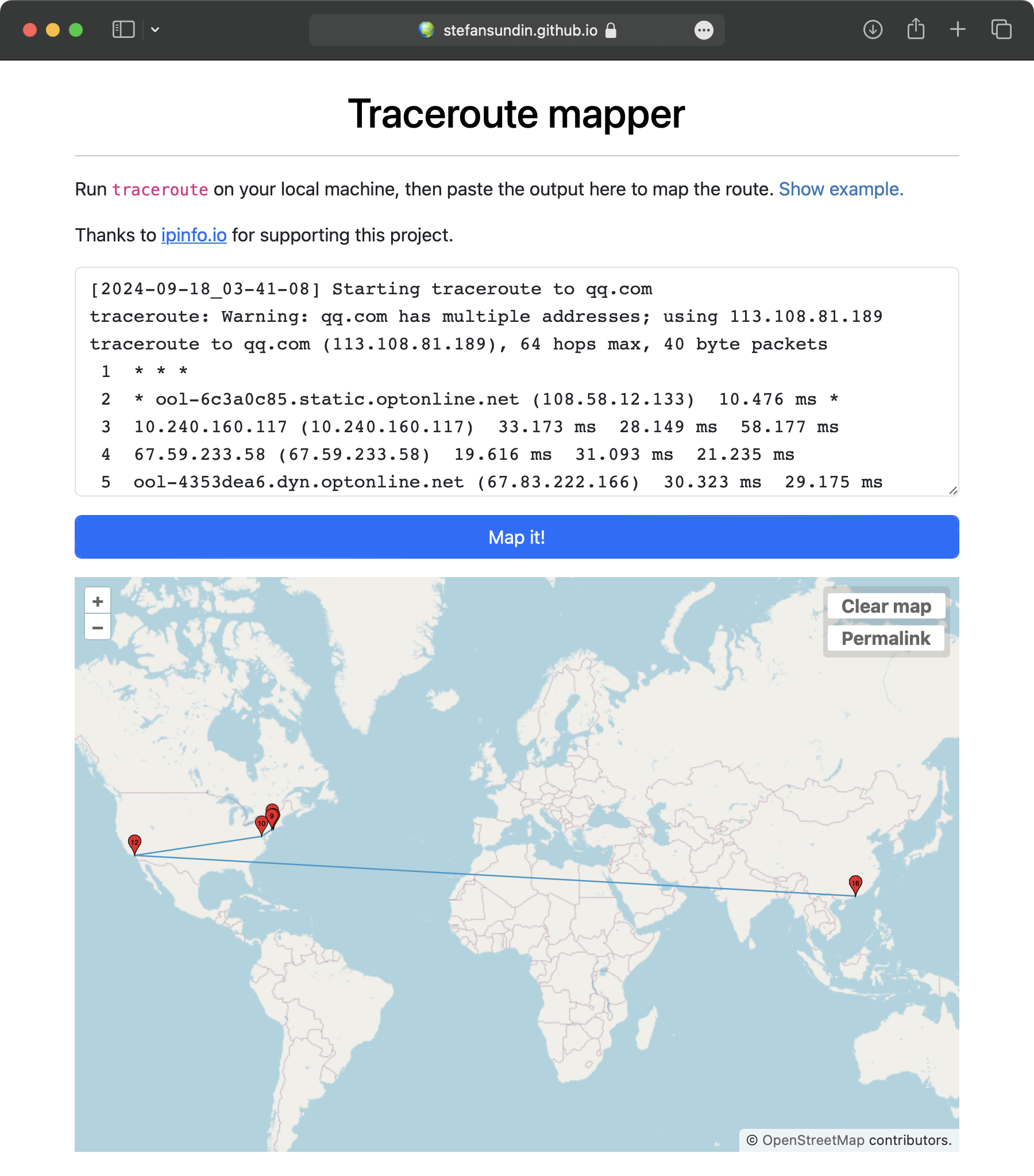 Finally, I tried mapping some of the traceroute outputs with traceroute mapper. The most interesting ones to me are the ones going between the US and China. Here are four different maps to qq.com in different network environments: