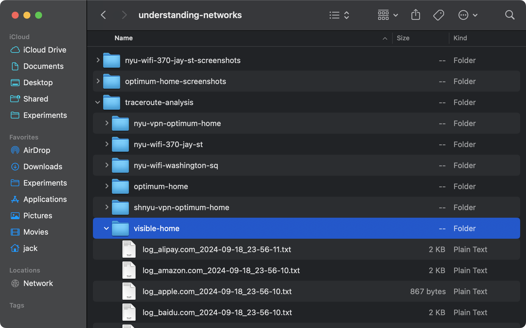 I came up with a list of 25 sites that I am interested in tracing and saved them all in a text file. Afterwards, it was pretty much a painless experience to trace these many sites. I traced these websites on NYU Network at both 370 Jay St and at the Bobst Library, on my mobile network (Visible) at a restaurant as well as at home. I also tried it while connecting to NYU VPN at home, both NYU New York VPN and NYU Shanghai VPN.