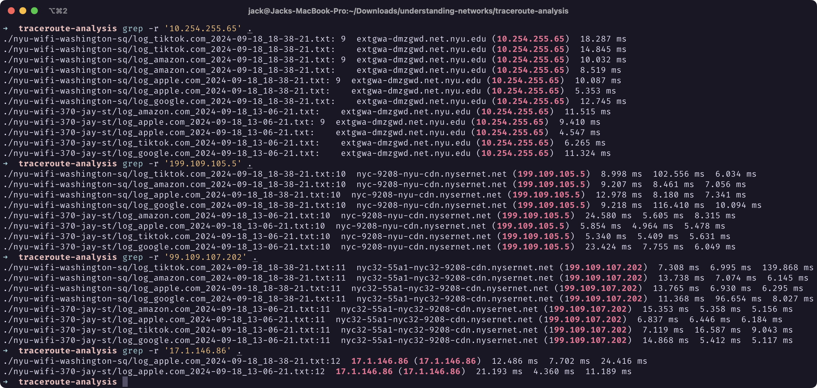 Since all logs are saved into text files, I can now run various commands on them to help me better understand the paths. First, I organized the logs into folders based on the network environment under which the traceroute utility was run. Then, I’d open up a log file I’m interested in, and use the grep utility to search within all log folders the IP addresses that appeared in this log file one by one. This way, from the IP addresses closest to in the path to the IP address farthest away in the path, I got to see which other files contain the same IP address. That helps me to understand whether an IP address is associated with my network environment, or with a target host. It also helps me to see which IP addresses are shared among some of the paths.