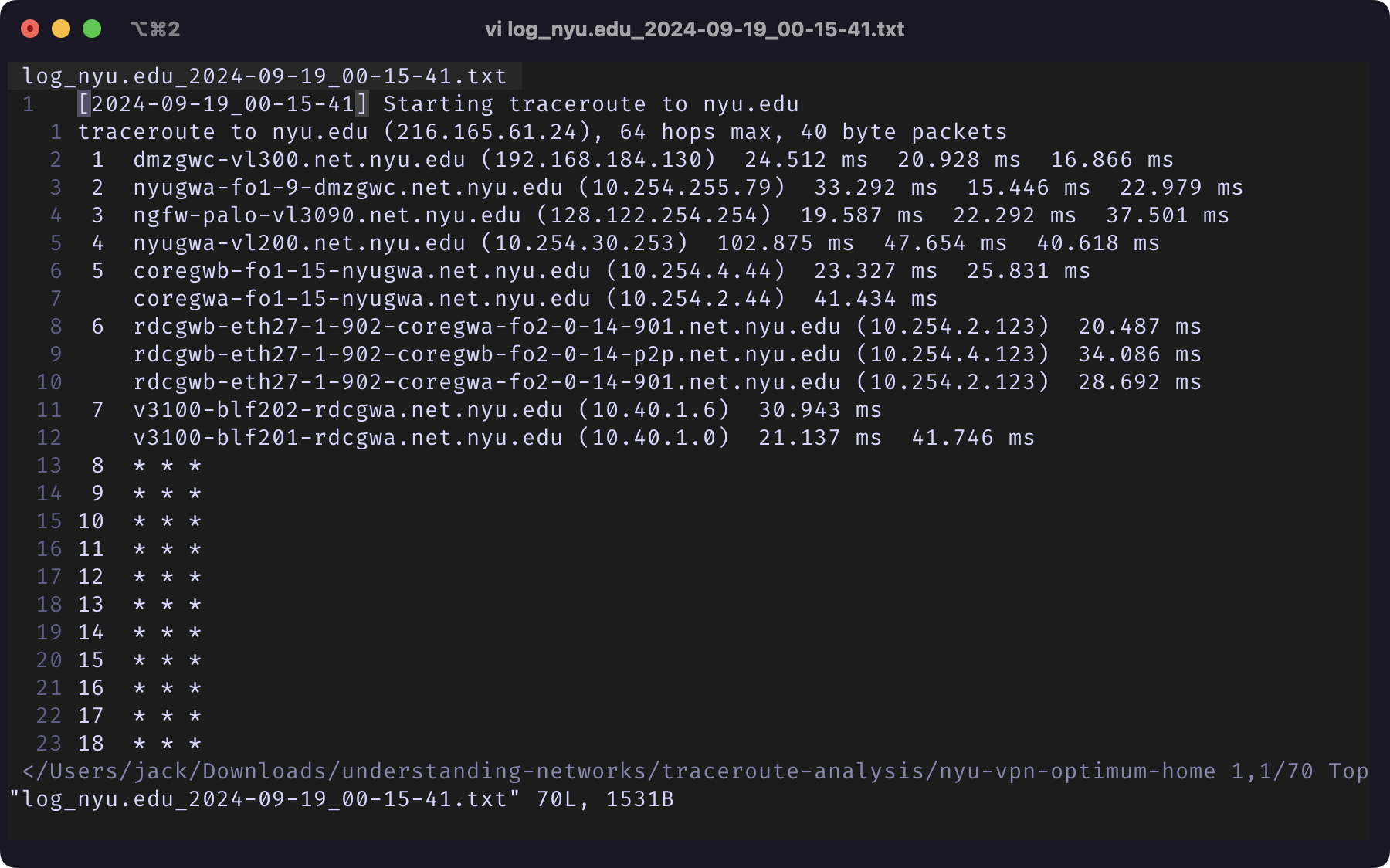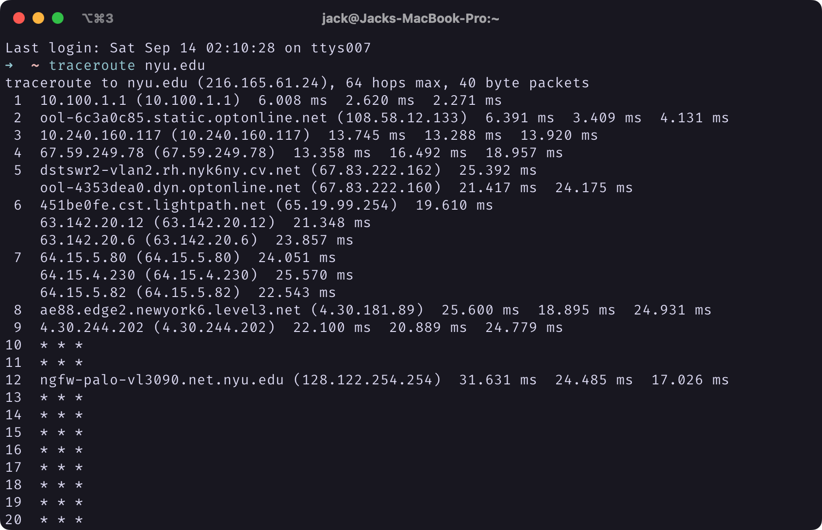 It was also interesting to see that when connected to NYU VPN at home, most traces are hidden from traceroute except for a few NYU-affiliated hosts.