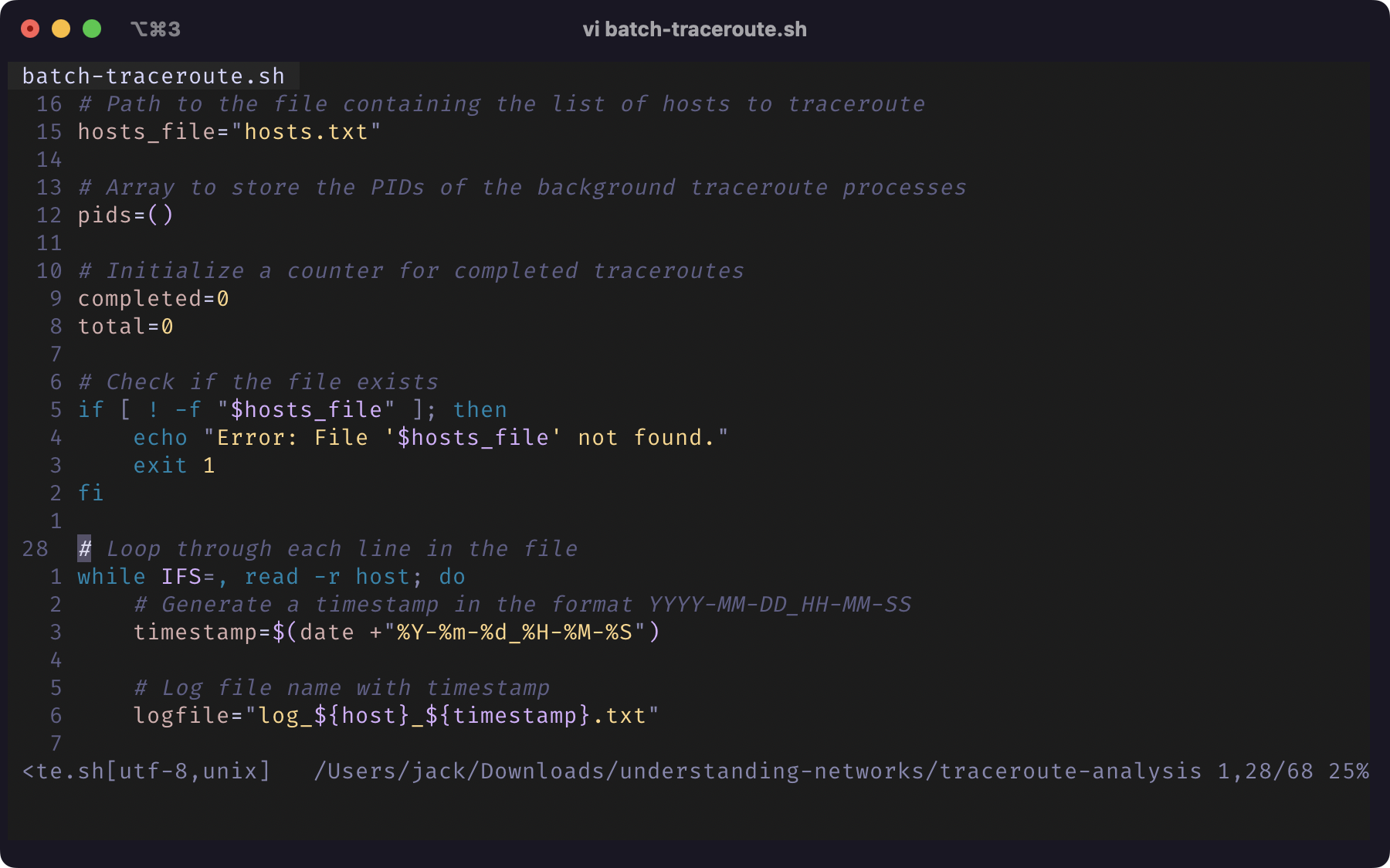 I thought this was a perfect opportunity to write a shell script to automate the process. That way I can simply run the shell script whenever I connect to a new network, and work on my other stuff while the traceroute runs in the background. With some help from OpenAI’s ChatGPT, I was able to create a shell script that reads hostnames from a separate text file, runs traceroute to them in background, logs the traceroute outputs to separate text files for each host, and reports the progress until all traceroute processes are completed.