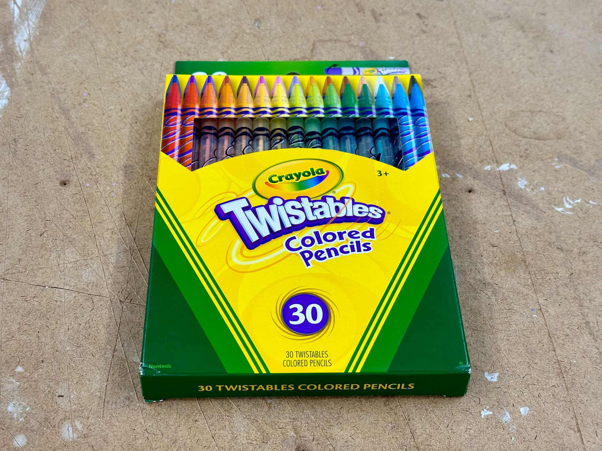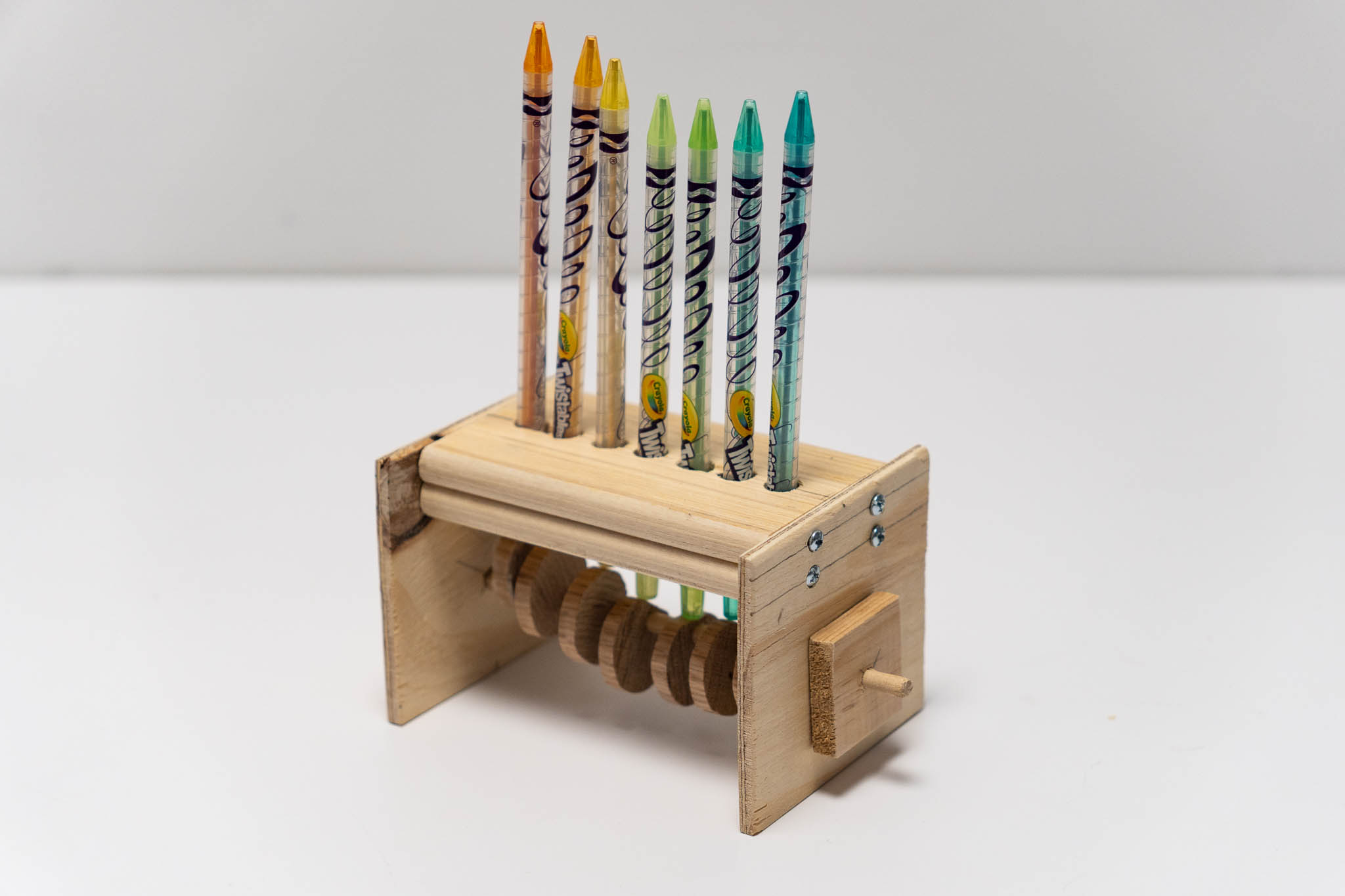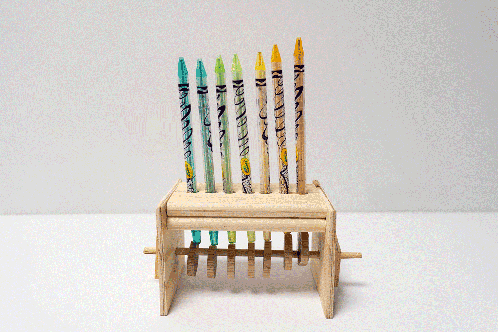 Finally, I needed to figure out what should go on top of the cams. My immediate thought was to have multiple short rods, which I did not have. I considered many different materials that I could find either at ITP or at NYU MakerSpace right across the street, but none of them worked. Despite it was a rainy day, I eventually decided to go to Target, the closest department store, and I found some Twistables colored pencils. They are smooth throughout, at just about the right length, and they are colorful. All seemed to be good characteristics for my prototype.