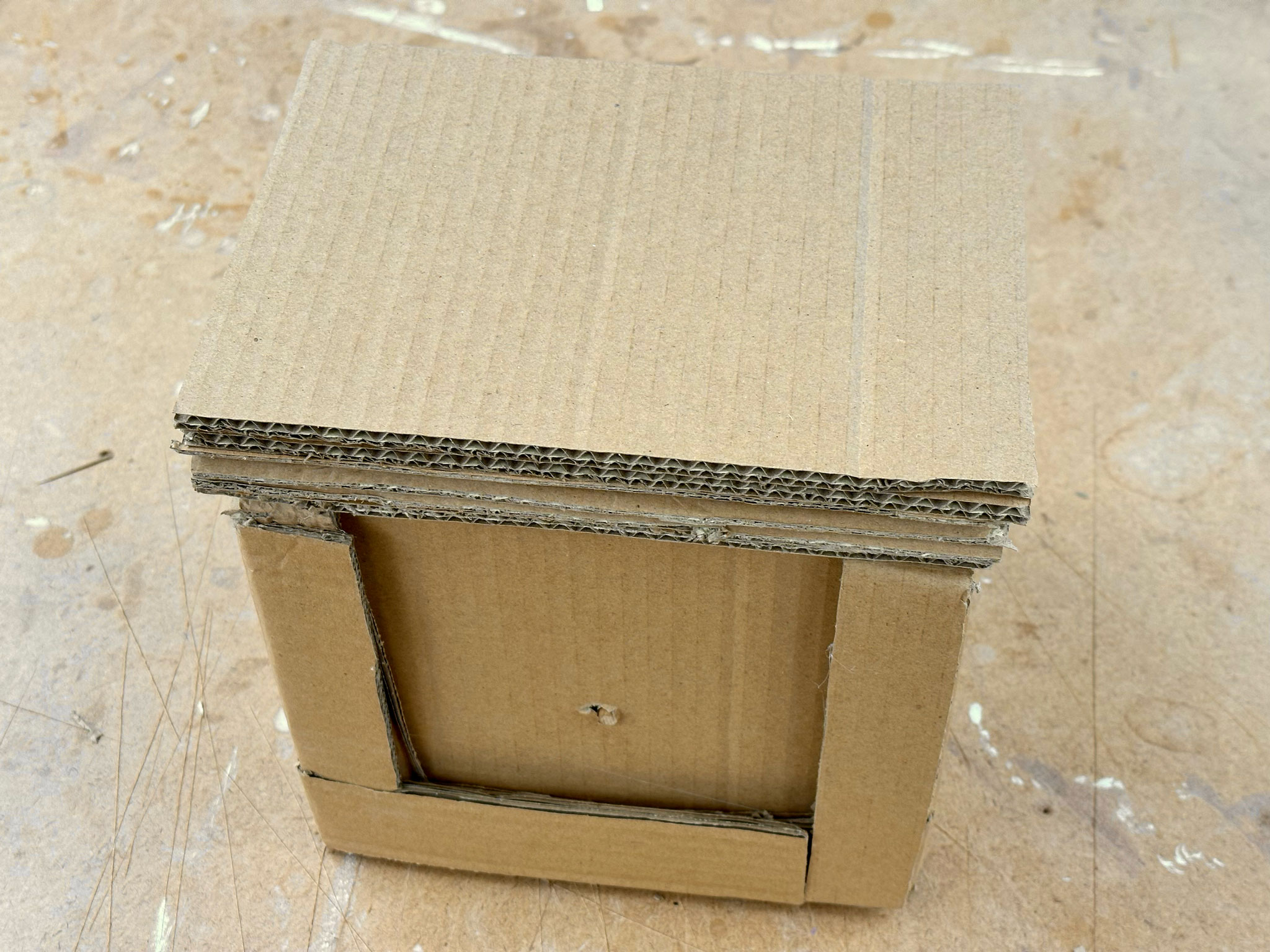 At this point, I needed build a structure to hold the rod. It was such a coincident that the unused portion of the cardboard box seemed to serve as a perfect base. I did some rough measurements and cut it into a shape that could be folded into a half-opening box.