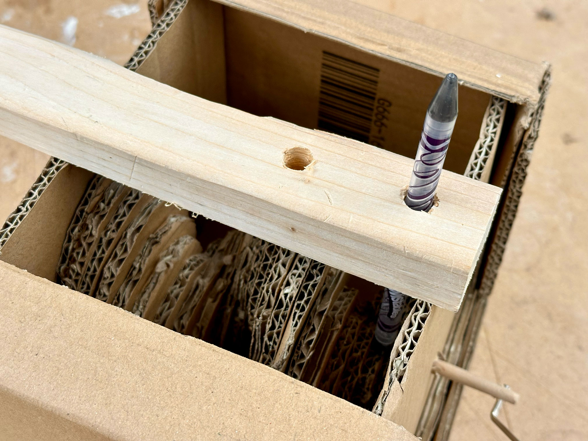 I was so excited to try them out! I made a thick cardboard block and drilled holes to hold the pencils in place. It was impossible get it to work. The holes were either too tight for the pencils to move freely, or too loose for the pencils to stay straight. I had to switch to a wood block, hoping it would work better.
