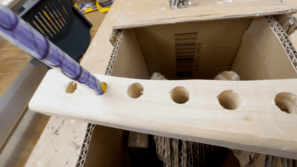 I quickly realized the glue sticks were too soft and kept getting caught by the cams. I had to switch to the pencils again, but the holes were designed for the glue sticks. I partially disassembled the structure and redrilled the holes with a hand drill to make them a bit bigger. I also used a Dremel to clean up the holes for a even smoother surface.