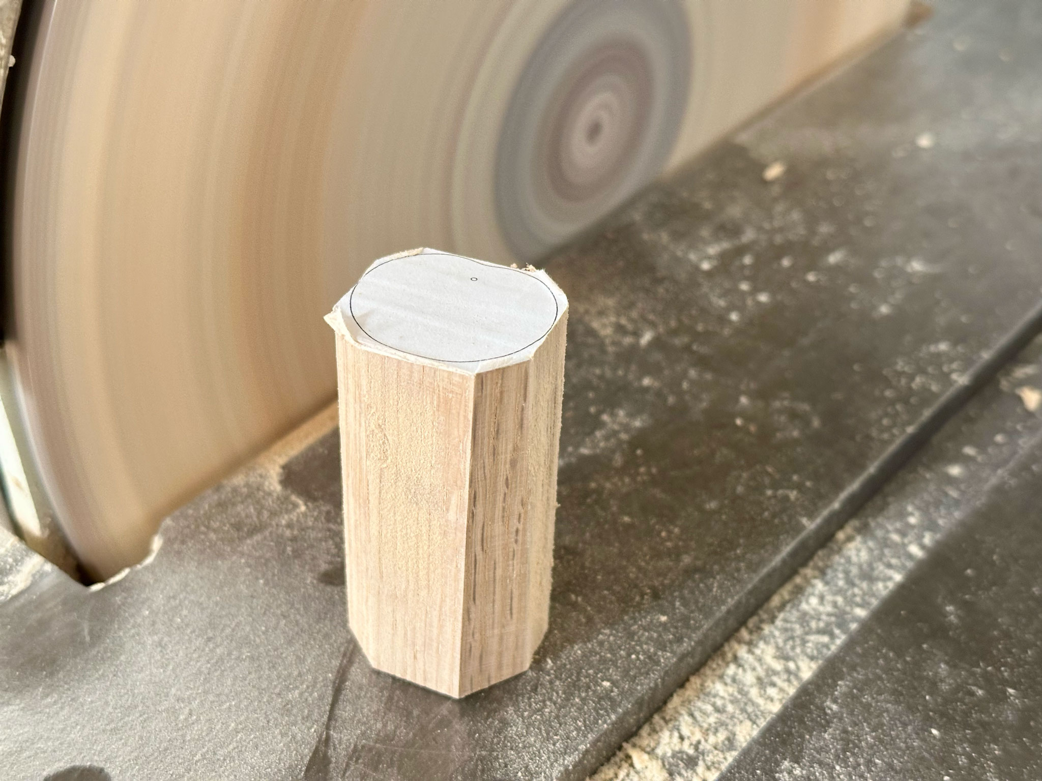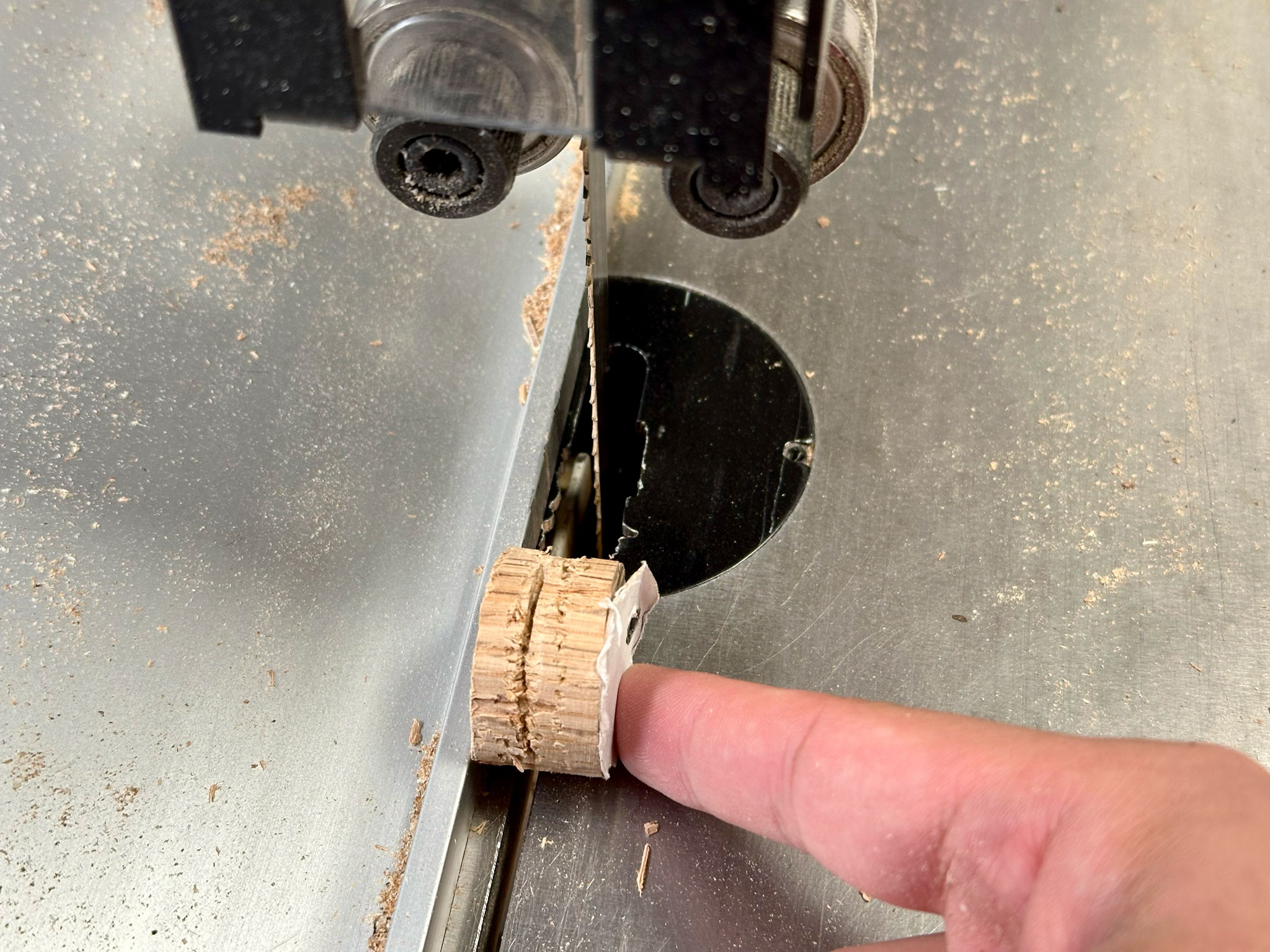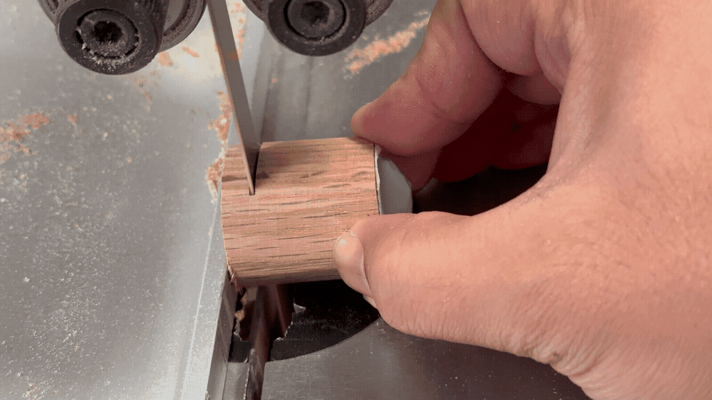 Once I shaped the wood block as even as I could, I moved back to the band saw to slice the block into even flat cam pieces by consistently pushing it against the fence.