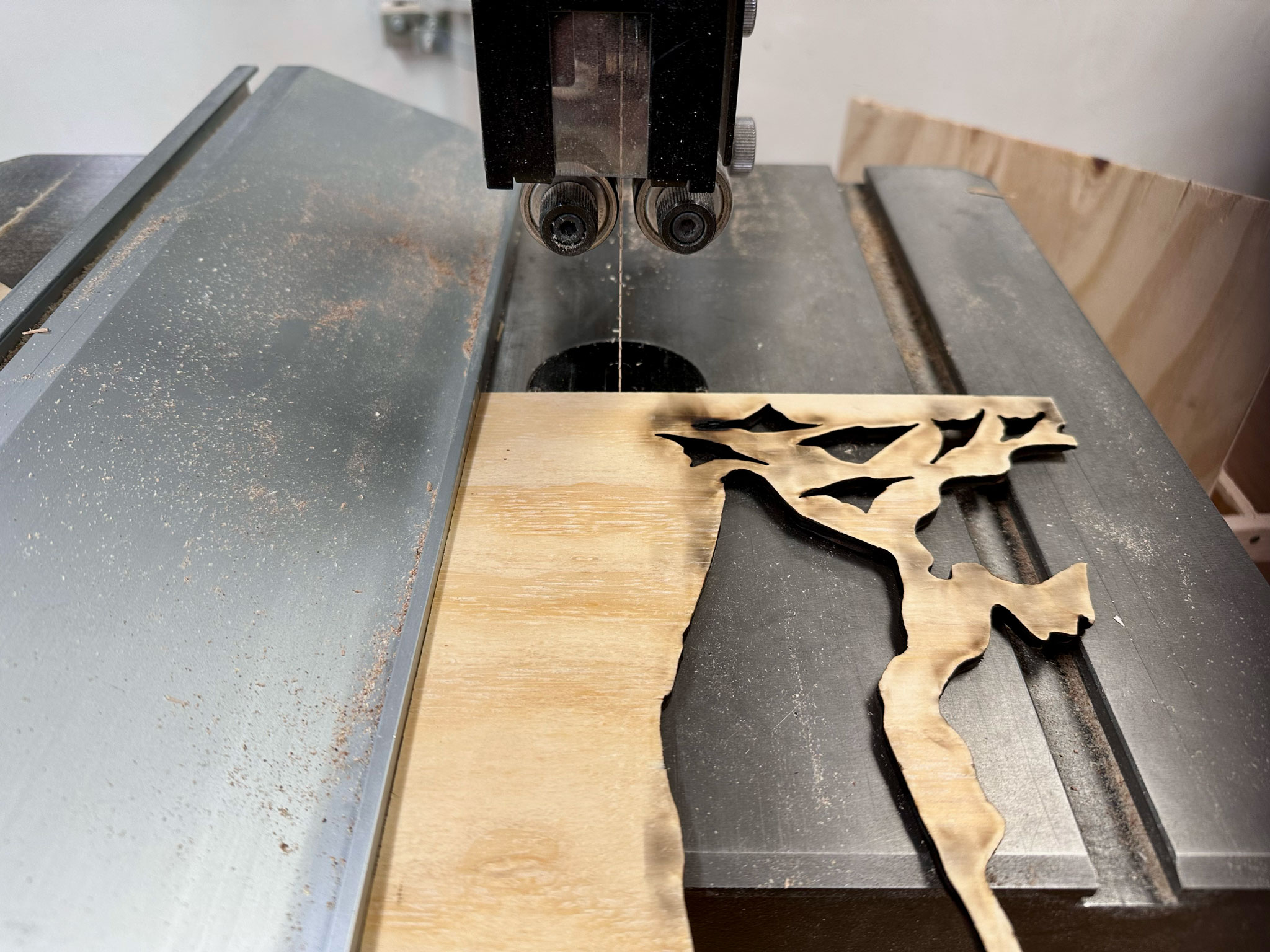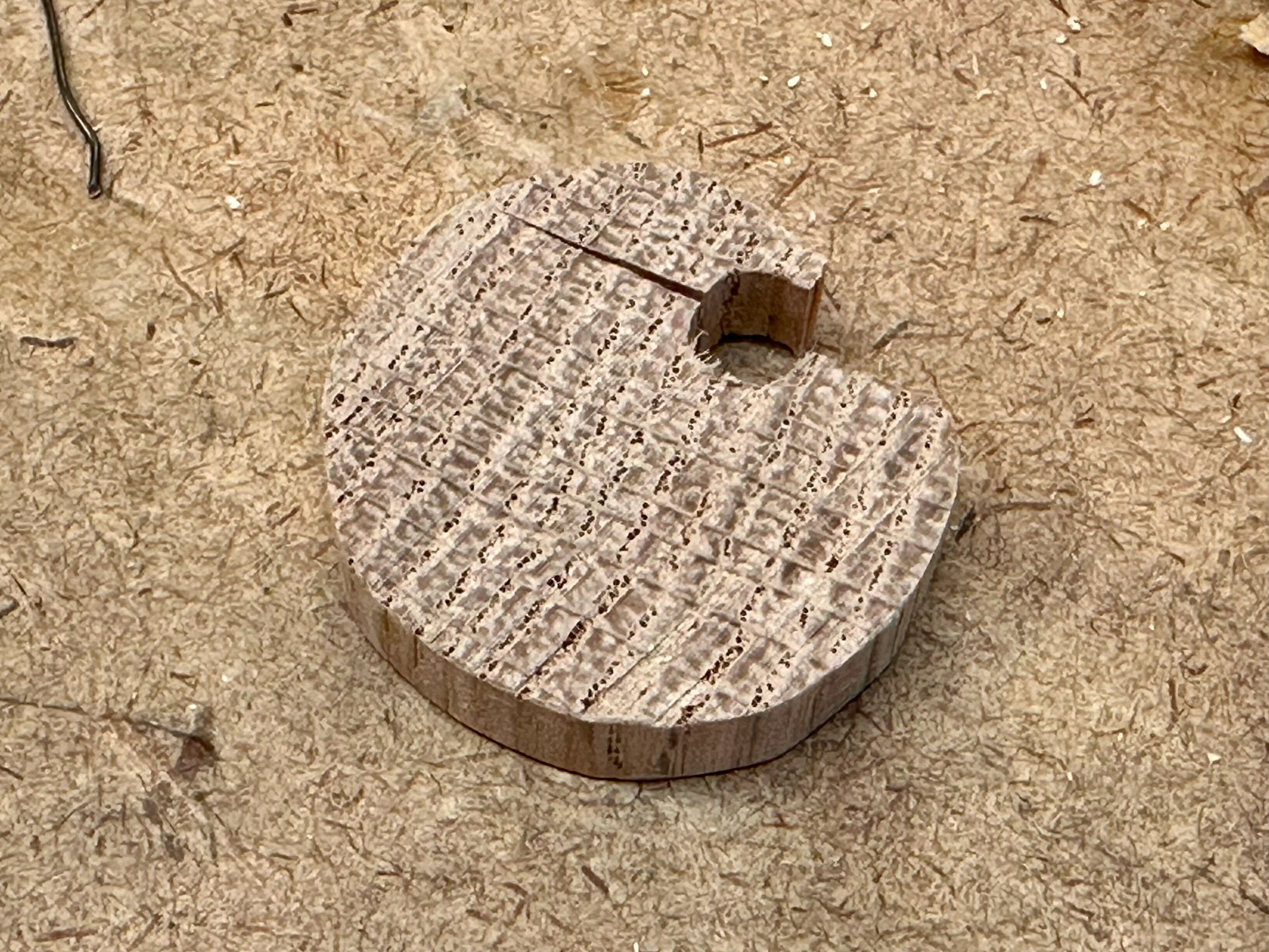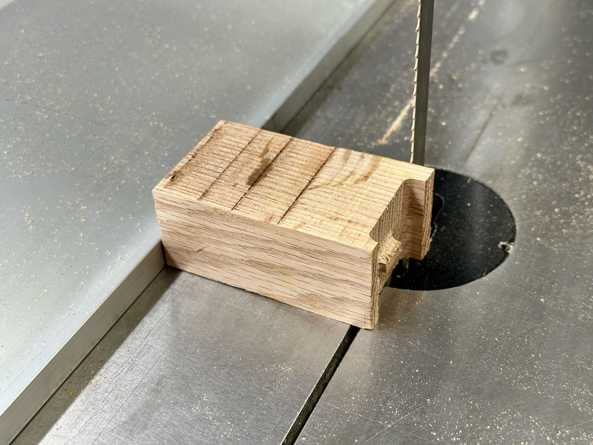Once I shaped the wood block as even as I could, I moved back to the band saw to slice the block into even flat cam pieces by consistently pushing it against the fence.